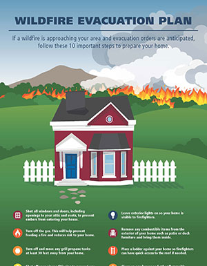 Download Wildfire Evacuation PlanIf you live in an area that’s prone to wildfires, it’s important to take steps in and around your home to reduce the risk of damage. Use this guide to learn how to make your property more resistant to wildfires and increase your home’s likelihood of survival.